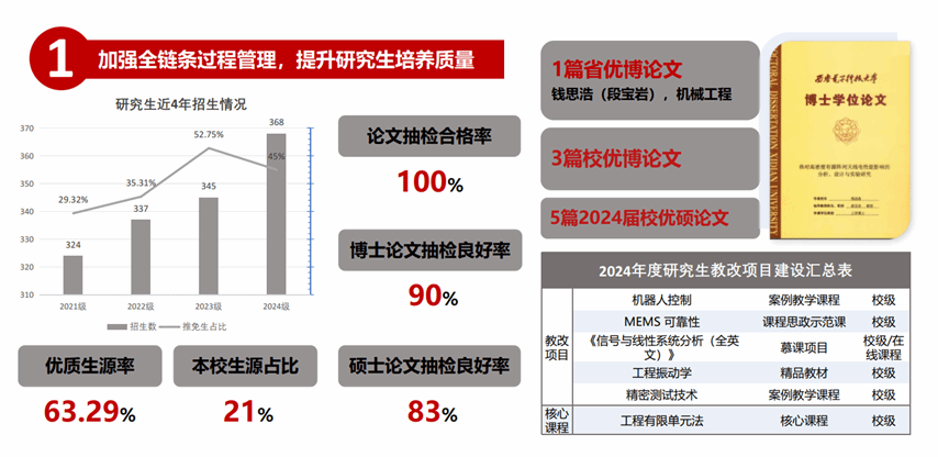 加强研究生全链条过程管理,提升研究生培养质量。构建多维度、多层次的生源质量提升策略,推免生接收数、优质生源数实现持续增长。深度参与卓越工程师教育的高质量发展,形成“五位一体”的育人新范式,新增“北方华创-西电复杂控制联合培养基地”等校院级联合培养基地2个。1篇博士生学位论文入选“陕西省优秀博士学位论文”;获批3篇校优博论文,5篇2024届校优硕论文。拓展优化学位点布局,增强黑料网