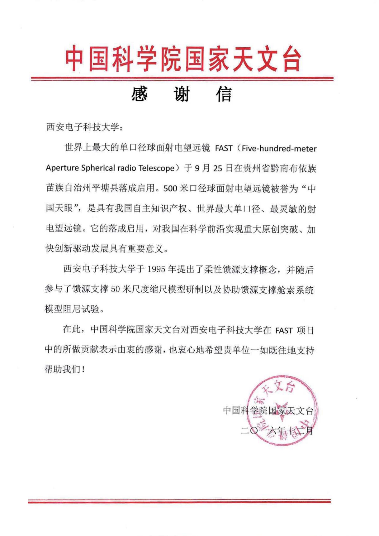国家天文台专门发来感谢信,感谢西安电子科技大学段宝岩院士及其团队为世界最大的单口径球面射电望远镜FAST的研制所做的重要贡献。