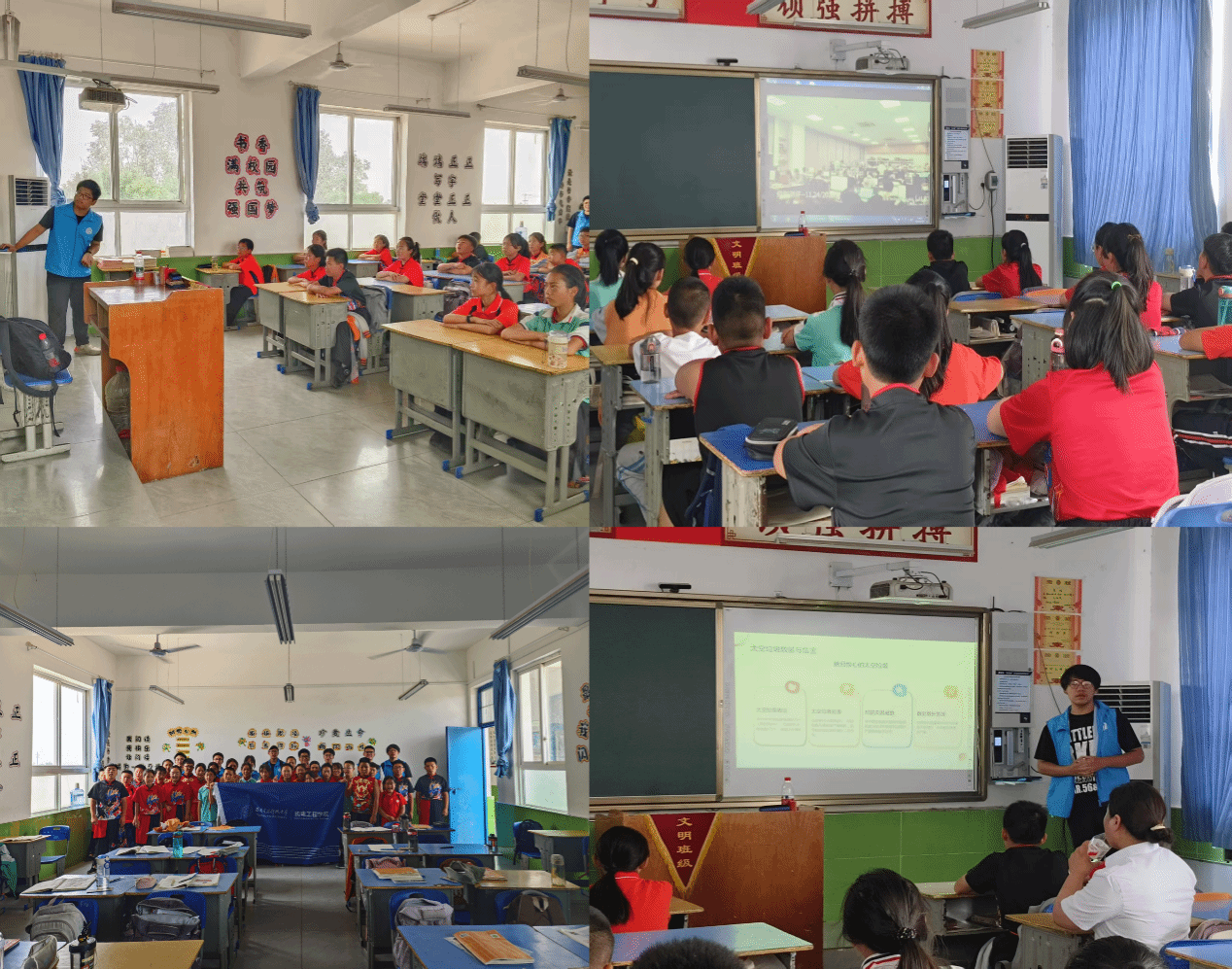 机器人工程专业学生来到教室,为同学们带来了别开生面的科技课堂,以专业知识分享激发学生对科技的探索热情。张佳硕同学以“IRobot机器人战队的发展与创新实践”为主题,从高校机器人社团发展的独特视角切入,讲述了西安电子科技大学IRobot机器人战队的成长历程,并以RoboMaster机甲大师赛参赛的机器人为例子,讲解了机器人运作的基本原理。李卓键同学以“太空垃圾清理”为主题,介绍了目前主流的太空垃圾清理方式和原理,并讲述了电动帆拖曳系统的创新性。两位同学带来的讲解,让孩子们对未来科技发展充满憧憬,极大地激发了他们的求知欲与创新精神。