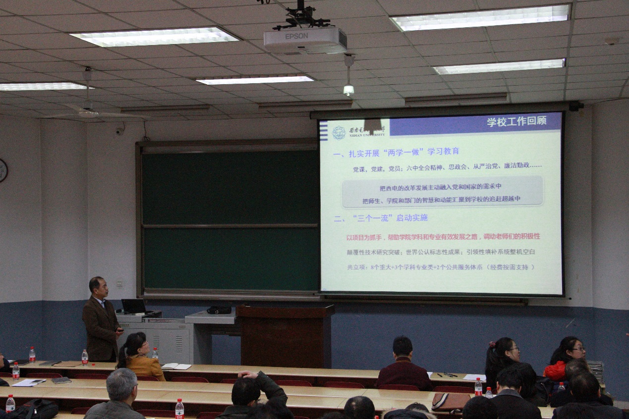 院长仇原鹰首先全面准确传达了校长郑晓静院士在学校工作会议上的讲话精神,详细介绍了2016年学校取得的主要成绩、当前发展面临的重要机遇及挑战和2017年度学校的重点工作及工作要求。