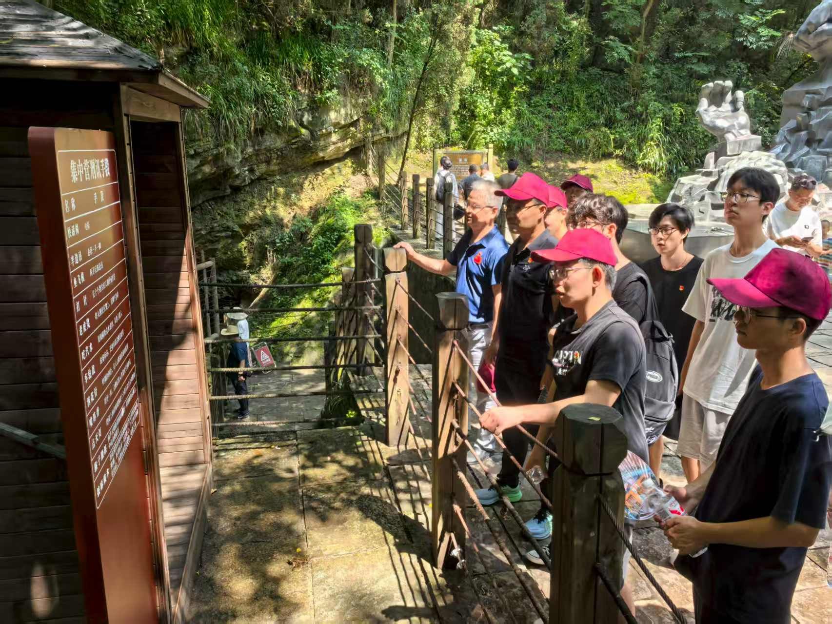 “入狱即入地狱”,讲解员的声音低沉而肃穆。穿过写有“抬起头来”的牌坊式大门,便是由数十间 "猫洞" 组成的刑讯区。潮湿的山洞里,锈迹斑斑的铁链仍固定在岩壁上,墙角的烙铁、老虎凳还保留着狰狞的原貌。革命者在这里每天要承受披麻戴孝、点天灯等20余种酷刑,但绝大多数人始终坚贞不屈。当听到罗世文烈士受刑后仍高呼“中国共产党万岁”,宋振中(小萝卜头)在狱中坚持学习、用铅笔头记录狱中见闻时,在场的年轻党员们眼眶湿润了——这些在历史课本上见过的名字,此刻化作一个个有血有肉的形象,他们并非天生的英雄,只是在信仰与酷刑的较量中,选择了守住比生命更重要的东西。