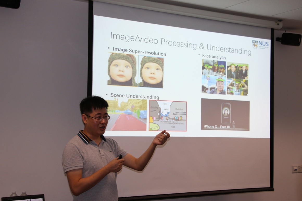 ,新加坡国立大学电子与计算机工程系、机器学习与视觉实验室负责人冯佳时(Feng Jiashi)教授向同学们做了“Deep Learning for Visual Understanding”的报告,讲解了深度学习及计算机视觉的原理和最新研究进展,详细讲解了两者的工作原理和应用现状,重点讲解了深度学习技术在人脸识别、深度图像超分辨率(Deep Image Super-Resolution)、图像去雨滴、图像去雾、图像去雾霾、超限人脸识别、人脸去遮挡与人脸年龄识别等方面的研究成果,并对其研究成果进行了演示,这些神奇的成果深深地吸引了同学们的好奇心,启迪了大家对科学研究的兴趣。