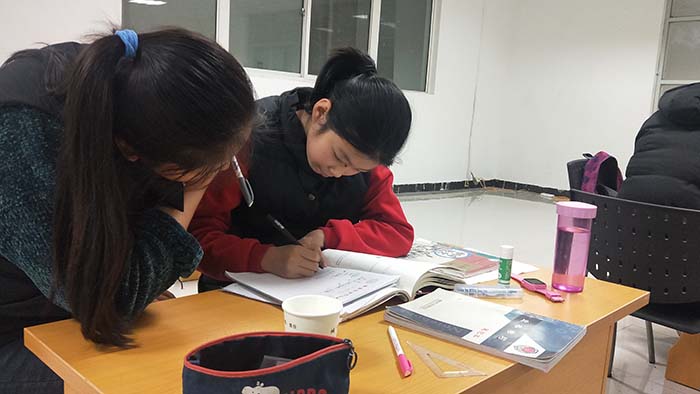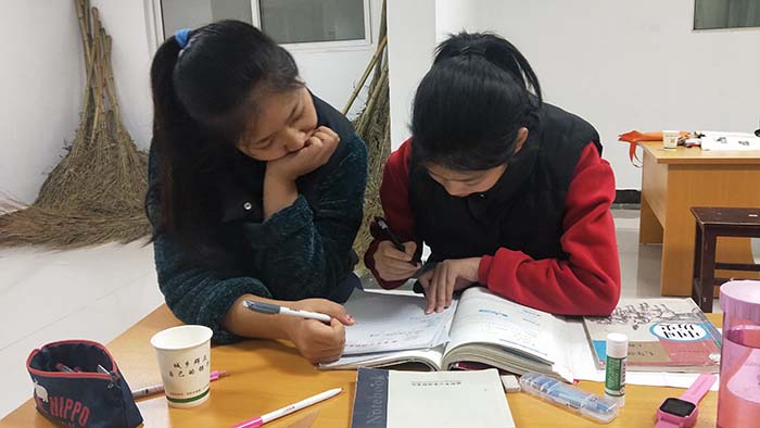 阿姨们下午两点上班,把孩子们带到学校来,她们工作时志愿者们便开始功课辅导活动。志愿者们先把桌椅按孩子们的年级分成不同的区域,确保每一个孩子身旁都有志愿者在辅导功课,又彼此不会相互打扰,然后开始对孩子们进行课业辅导。