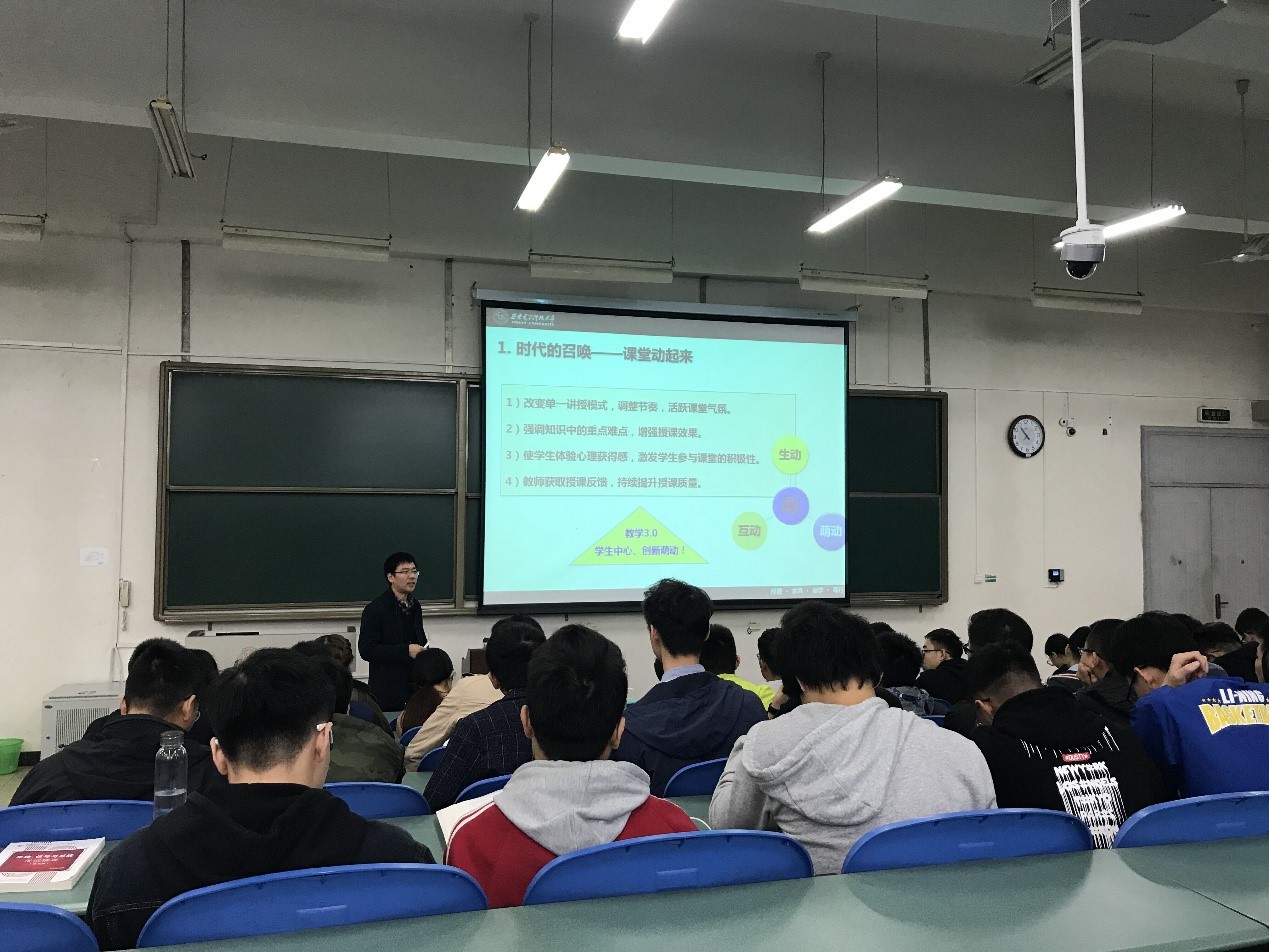 他认为,传统的“我听你讲,你教我学”教学模式缺乏有效互动,课堂效果不甚理想甚至出现大多学生玩手机睡觉的现象,老师也得不到学生对知识的掌握程度的真实数据。 “教师主导,师生互动”的教学模式有效促进了师生活动,但是在新时代人才培养理念的驱动下,现在的教学更应该体现“学生中心,创新萌动”的思想,营造“改革创新,追求卓越”的教育文化。为了实现课堂动起来,他用雨课堂给同学们随机出题,并开启弹幕和投稿功能,使得课堂气氛十分活跃,同学们也都积极发言。