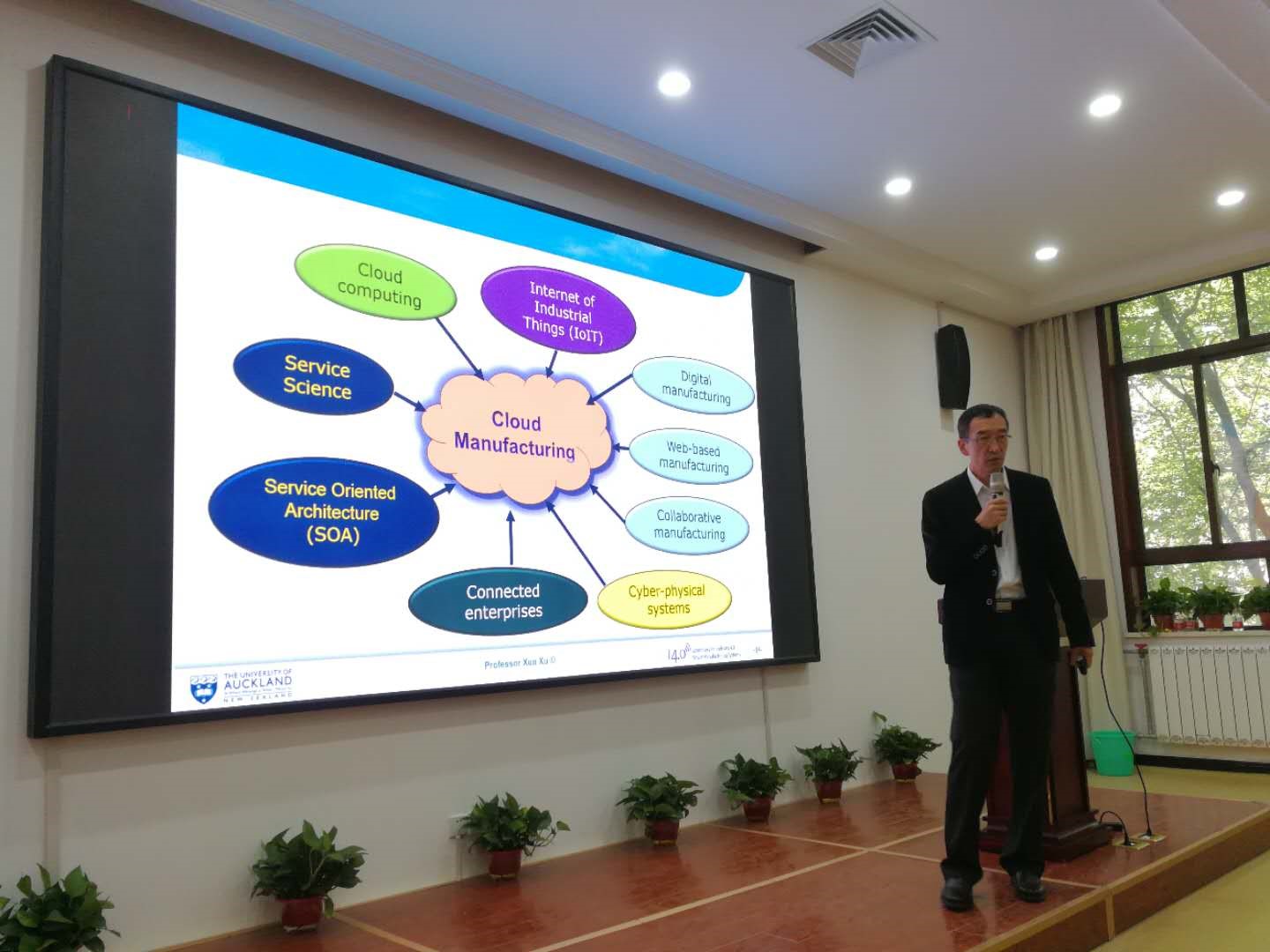在关于云制造的报告中,Xu教授首先介绍了云计算、服务科学、面向服务的制造等概念,由此引出了云制造;其次,Xu教授以Autodesk 360 Platform为例阐述了Platform as a Service (PaaS)的理念。接着,Xu教授从工业的视角对云制造进行了探讨,包括服务用户和服务提供者能够获得的优势以及开展和实施云制造的前提条件等。最后,给出了一个从云端对机床进行控制的例子。