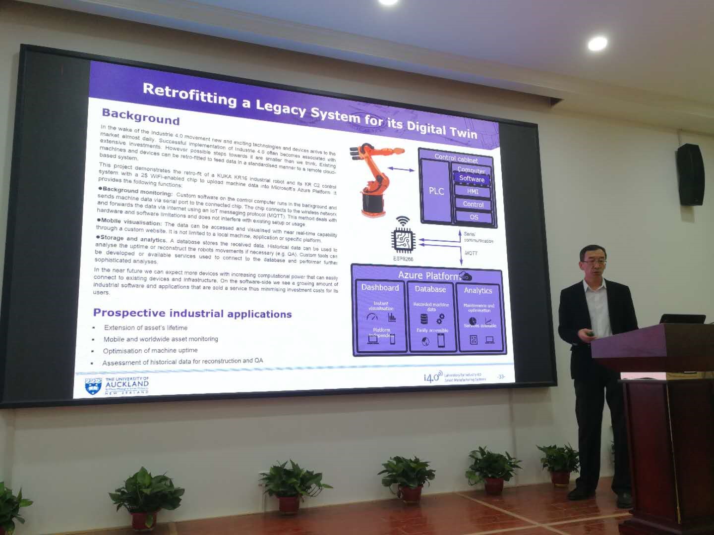 Xu教授还介绍和展示了新西兰奥克兰大学工业4.0智能制造实验室正在从事的研究工作,包括面向装配的虚拟现实、基于MTConnect的面向智能制造的信息物理机床、个性化智能可穿戴设备、工业机器人数字孪生模型、基于RFID的智能AGV小车、基于IoT的智能制造运作以及基于大数据分析的实时机床状态监控等。