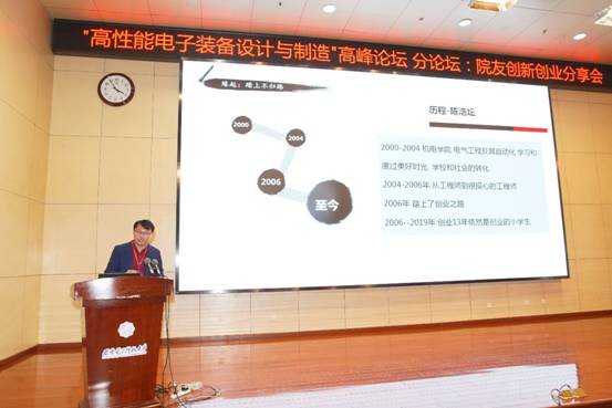 在南校区行政楼210报告厅举办“高性能电子装备设计与制造”高峰论坛分论坛——院友创新创业分享会,上海捷盟信息科技有限公司董事长李亚洲、上海易清智觉自动化科技有限公司联合创始人兼总经理王仁杰、上海思依暄机器人科技股份有限公司董事长陈浩坛作为报告嘉宾分享了他们的创业历程,启发同学们关于人生规划和创新创业等问题的思考。分享会由黑料网