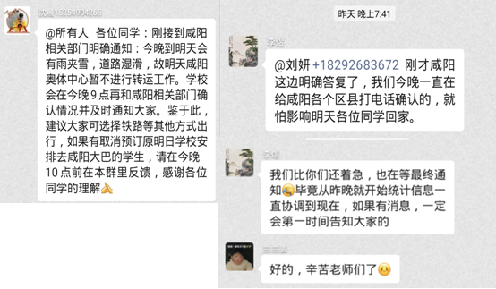辅导员以及班长在班级群里及时发布学校通知,统计信息、通知离校返家注意事项。他们还逐一敲开学生宿舍的门发放需要的证明材料,并嘱咐同学们“到家的第一时间就给我发信息,路途中不管遇到任何问题,都要第一时间和我联系,学校和老师会尽全力帮助大家解决遇到的问题!”