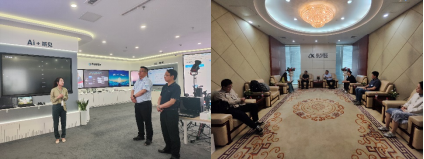 一行访企拓岗的最后一站来到了科大讯飞股份有限公司。通过参观公司产品展厅,详细了解了讯飞AI在教育、城市、医疗、工业等多个领域取得的成果,并实际体验了多语种语音识别、智能文档与图片生成、报表分析与生成等多个场景下的实际应用。座谈会上,公司招聘总监王祯介绍了科大讯飞近几年在西电的招聘情况与公司人才培养情况,并表示希望能进一步扩大科大讯飞在学校的影响力,从而招聘到更多优秀人才。沈强与陈武表示通过参观交流,对科大讯飞的行业头部地位及技术优势有了更清晰的认识,希望后续双方继续加强在人才培养、科研项目、校企合作等方面的深入交流。