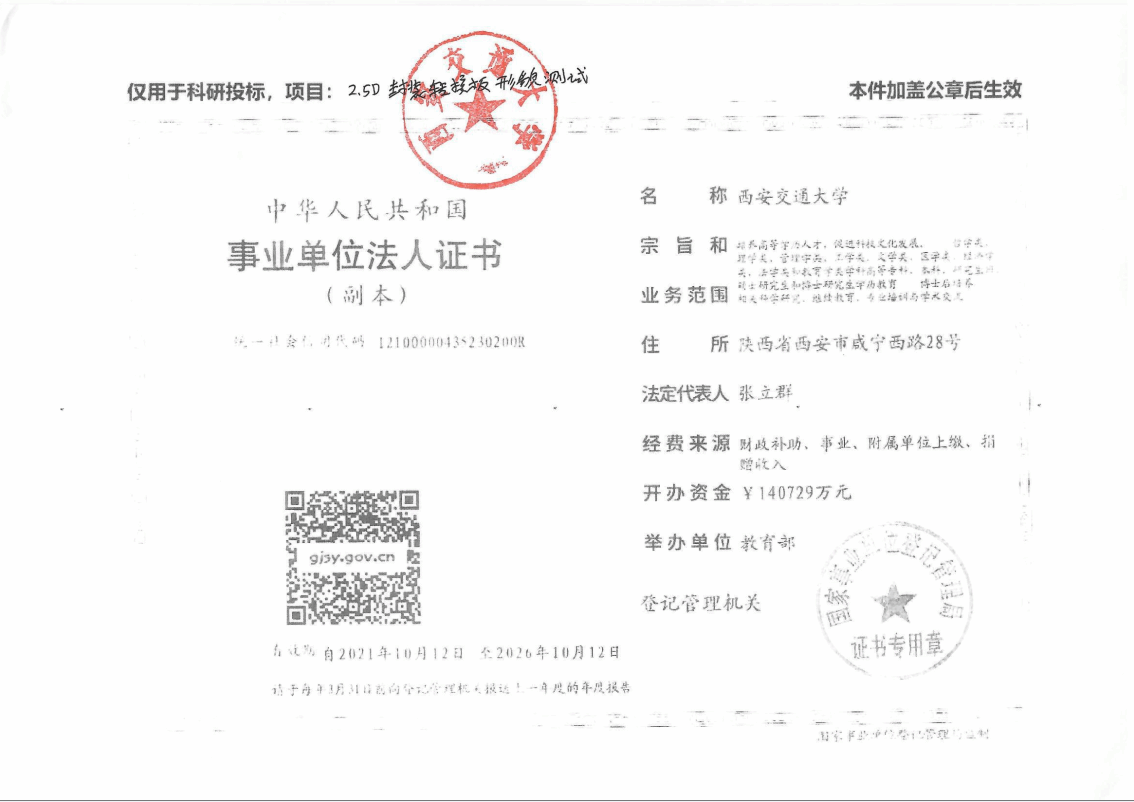项目的管理,确保面向射频器件2.5D封装转接板多场耦合可靠性研究的顺利进行。西安交通大学与项目负责人王永坤将开展科研合作,现将合作相关事项公示如下: