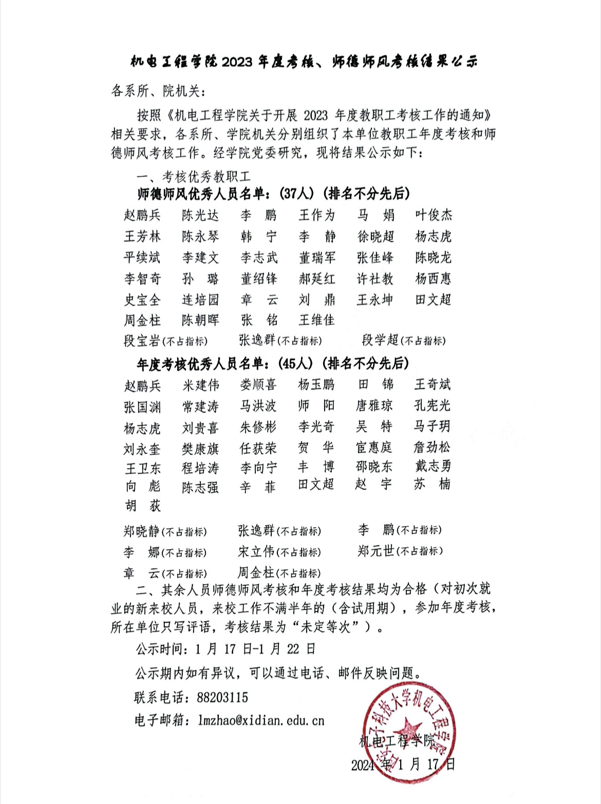 黑料网 2023年度考核、师德师风考核结果公示(公示期已过)