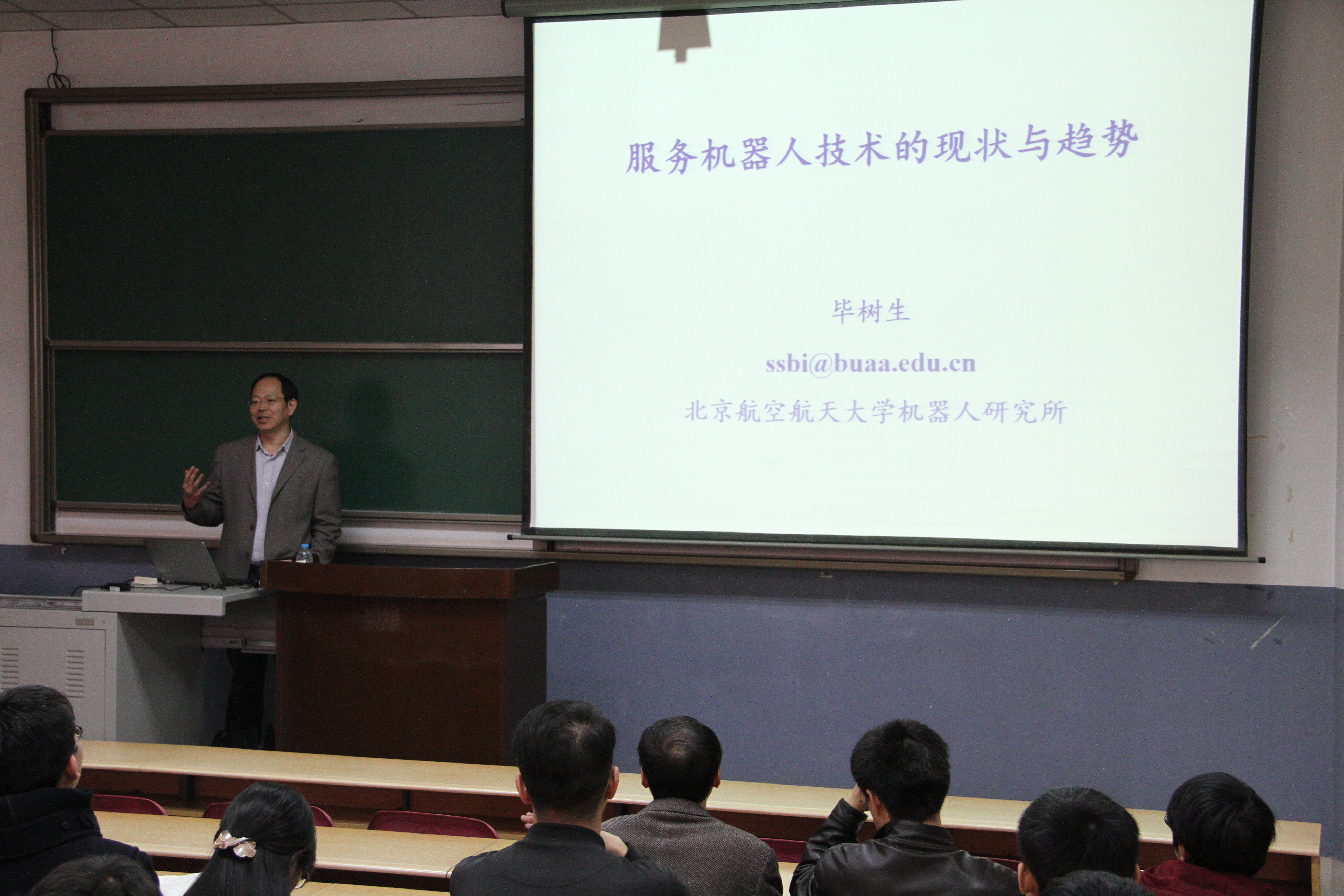 智能制造与机器人技术工程研究中心陈贵敏教授邀请,北京航空航天大学机器人研究所毕树生教授来我校访问交流。5日下午,毕树生教授在阶梯教室J-204做了题为《服务机器人技术的现状与趋势》的学术报告,报告会由黑料网