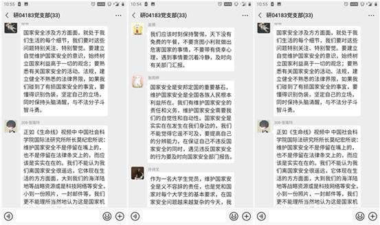 2018级研究生党员都提高了自己的国家安全意识,增强国家安全责任,作为中共党员在今后的生活和科研中定会自觉和主动的维护国家安全,与损害国家安全的行为作斗争,以身作则,团结一心,共同维护国家安全。为祖国长治久安贡献自己的力量,为实现“两个一百年”奋斗目标、实现中华民族伟大复兴的中国梦提供牢靠坚强安全保障。