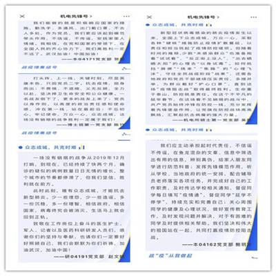 党员利用专业所长,奉献党员力量。学生党员李帅主动帮助街道维修宽带上网问题,并协助联通工作人员共同解决街道网速问题。学生党员高翔与周围热爱健身的同学共同制作运动短视频,指导同学们积极锻炼身体。本04171党支部成员发挥自己专业优势,设计出一幅幅生动形象的抗击疫情宣传画,表达战胜疫情的信心,为武汉加油,为祖国加油。