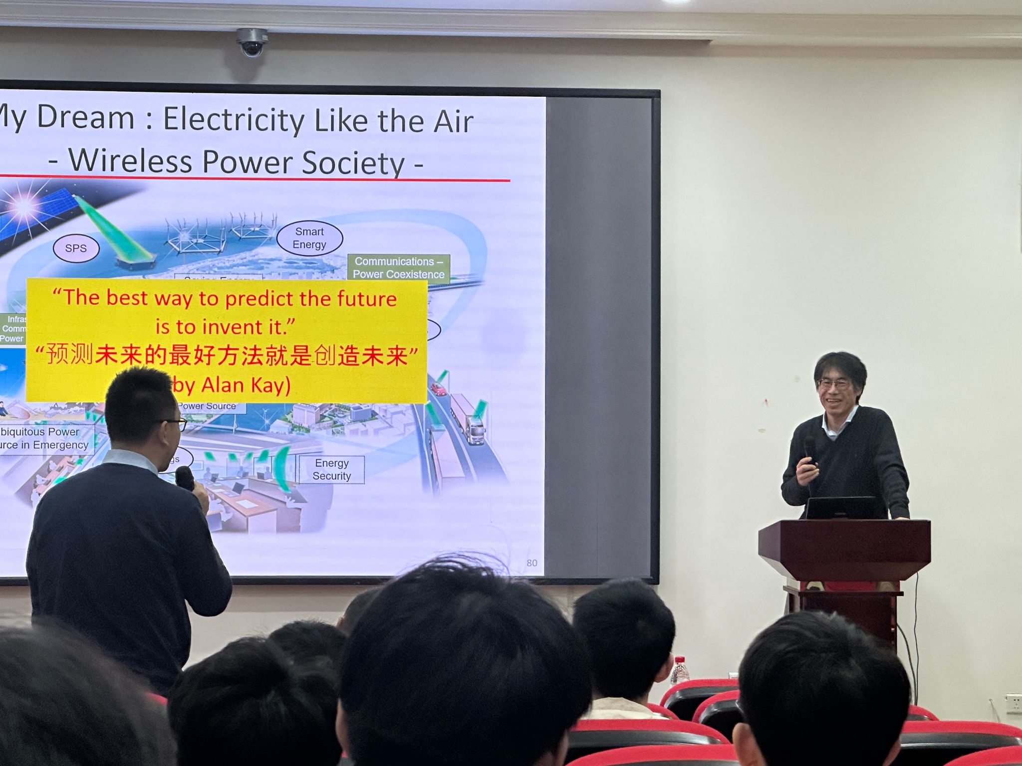Shinohara教授回顾了空间太阳能电站从上世纪70年代的科幻构想到如今多国竞相布局现实工程的发展历程。他指出:“SSPS通过地球同步轨道上的太阳能卫星收集能量,以微波形式无线传输至地面,可实现24小时稳定供电,是应对全球变暖与能源危机的重要技术路径。”他提到,京都大学团队已在实验室内实现千瓦级微波能量传输,并正推进高空平台与小型卫星验证项目。Shinohara教授通过清晰的图示、翔实的数据和生动的案例,深入浅出地阐释了微波传能中的关键技术瓶颈,如高功率发射天线设计、大气衰减补偿及接收整流效率提升等。他认为:“SSPS不仅是能源方案,更是连接学术、产业与国际合作的桥梁。”