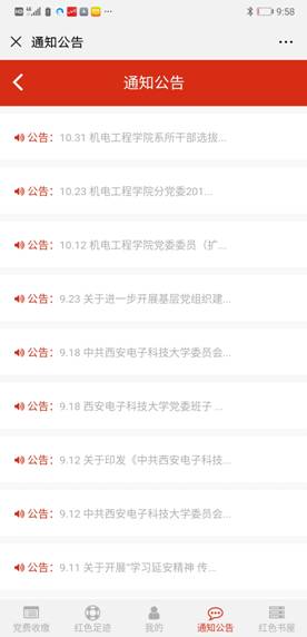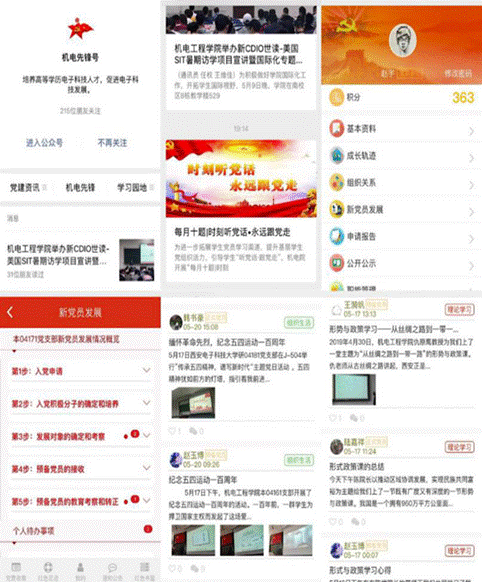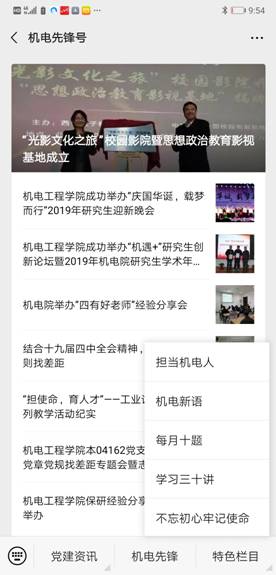 党建微信公众平台“机电先锋号”搭载的“一云台两专栏四推送”---即“党建云”智慧管理系统平台,“党建资讯”、“特色栏目”两个专栏将党章党纪党规和专题教育的相关内容融于其中以及每月推送四次党建要闻宣传党的政策、传达上级精神、交流“不忘初心、牢记使命”主题教育的工作经验。特别是通过“机电先锋”党建云智慧管理系统平台大大提高了基层党组织的工作效率:通过“党费收缴”实现党费一键“秒交”,每月按时交党费,永远不忘共产党员身份;通过“红色足迹”方便分享党员个体的学习体会和成长经历,拉近了心与心的距离;通过“通知公告”把中央要求、上级文件、工作安排轻松放到每个党员口袋里;通过“红色书屋”把成千上万本理论书籍摆到大家面前,网上下单分分钟送到;会议通知、电子签到、党务公开、组织建设一个个功能真正做到整合资源、充实数据、科学运用、优化机制,营造“红色空间”党建氛围,切实提升了黑料网