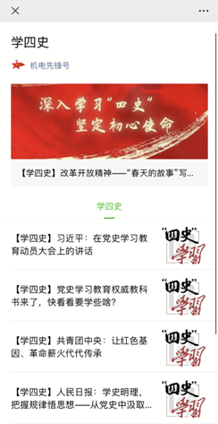 党建公众号“机电先锋号”中的“学四史”专栏、“习论教育微讲堂”专栏及相关文献书籍主动进行自学,将自学内容与线上线下培训紧密结合。